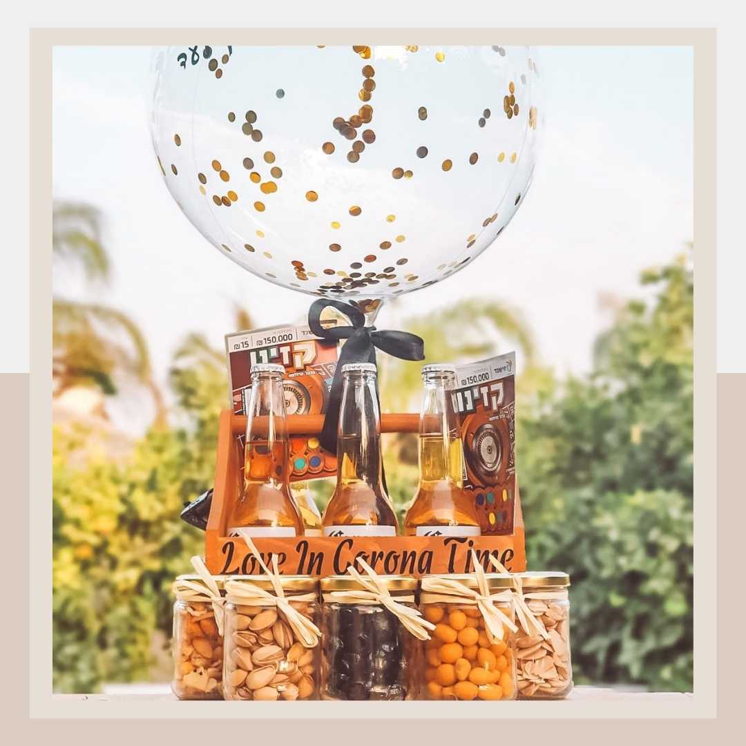 שישיית בירה, כרטיסי גירוד, צנצנות זכוכית המכילות סוגים שונים של פיצוחים ובלון ממותג באופן אישי.