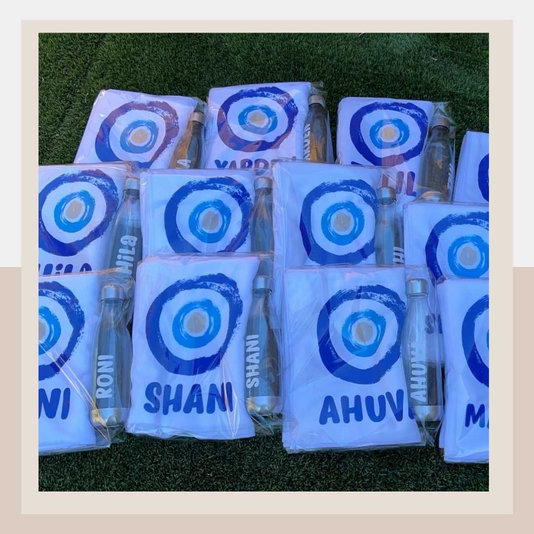 - הדפסה בהתאמה אישית על המגבת ומדבקה בחיתוך לייזר על הבקבוק – כל פריט ייחודי ומיוחד