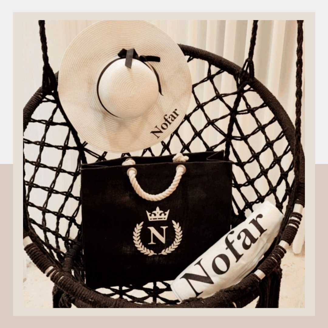 תיק יוטה שחור עם ידיות לבנות.