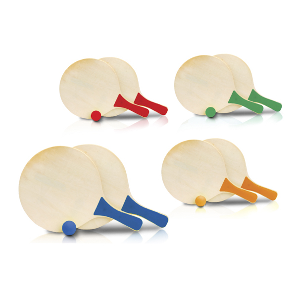 זוג מטקות עשויות עץ עם ידית צבעונית וכדור תואם להצעת מחיר לחץ כאן